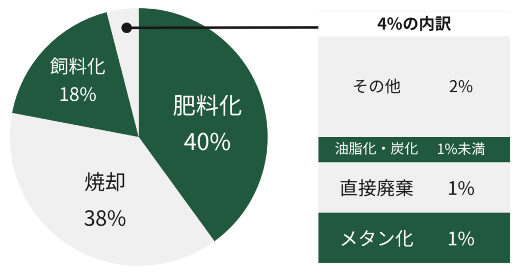 内訳は、肥料化が約40%と最も多く、次いで飼料化が約18%となっています。