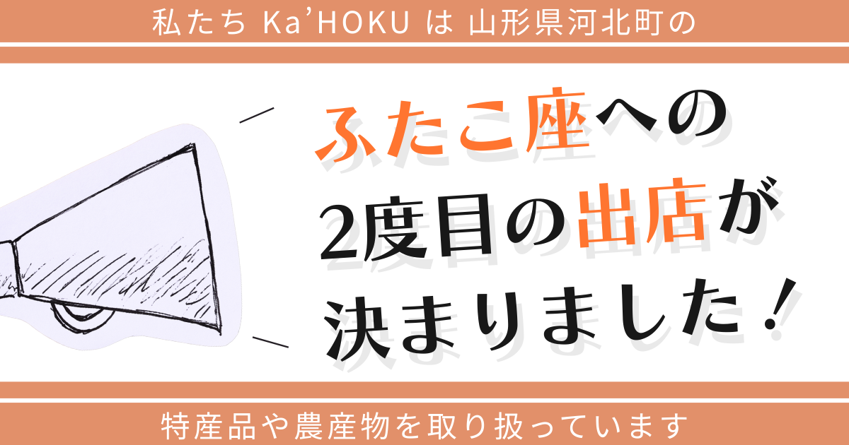 私たちは「Ka’HOKU」(かほく)という名前で、山形県河北町(かほくちょう)の特産品や農産物を中心に販売をします。